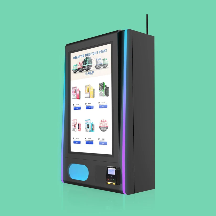 Mega Wall 2.0: High-Capacity Wall-Mounted Vape Vending Machine: Now upgraded with a password-protected electronic lock, LED lighting, and a wider tray to accommodate larger box-style products with ease.